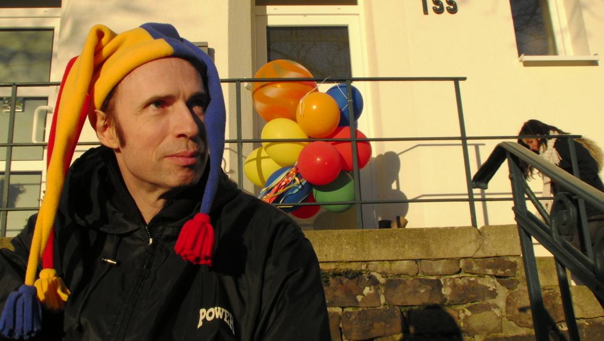 Menschen mit Narrenkappe oben im Foto sitzt am Schlagzeug und an allerlei