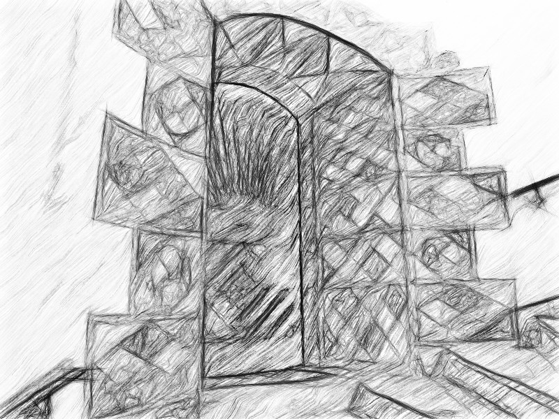 Ein schlankes tänzerisches Etwas, das sich die Treppe hochwindet - vorbei an fackelbeleuchteten Türen. Jede der drei Türen der Wendeltreppe ist anders bemalt.