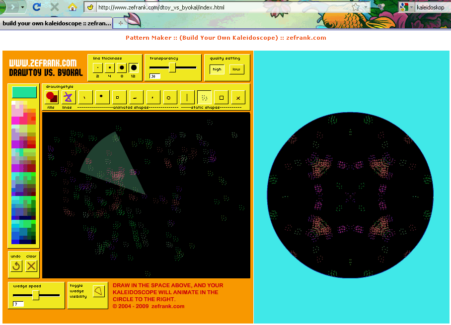 Hier ist was zum Spielen, liebe Kinder. Ihr müsst in die schwarze Fläche links hineinmalen mit den Werkzeugen drumrum. Dann wird euer Gemälde rechts "kaleidoskopiert".