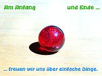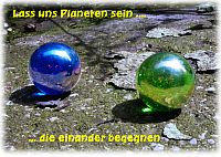 Postkarte links auf anhand zweier großer Reisemurmeln