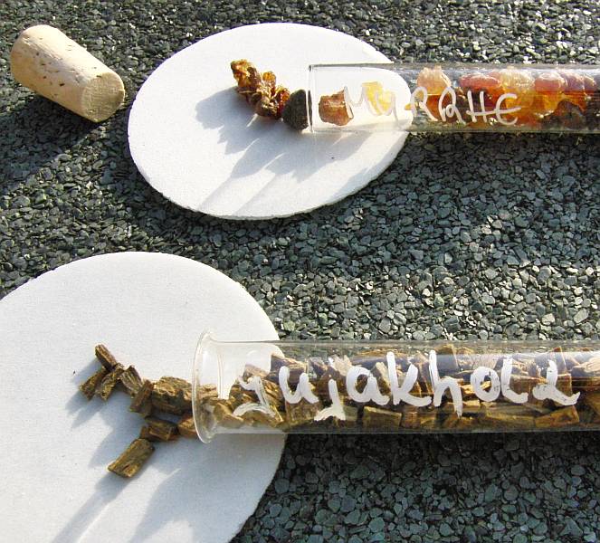 Zwei großformatige Bilder loben hier das klassische Räucherwerk. Die Kohle, auf der im rechten Bild Myrrhe und Gujakholz ihre Düfte verströmen, ist modernste Chemie - so geschickt gepresster Kohlestaub, dass der schwarze Brocken mit einem Streichholz an einer Stelle entzündbar ist und dann selbstständig durchglüht - was keine Kohle so machen würde. Zurück zur "Räucherseite" im ersten Buch von Charys