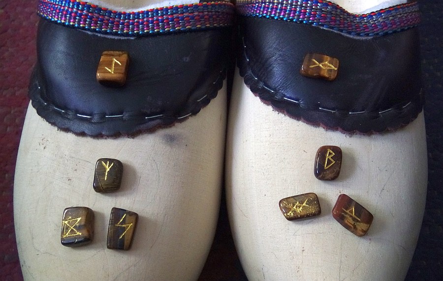 Film 2: Auswahl der Runen, die gebrannt werden. Zunächst werden sie als Steine auf das Schuhpaar gelegt.