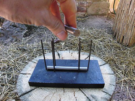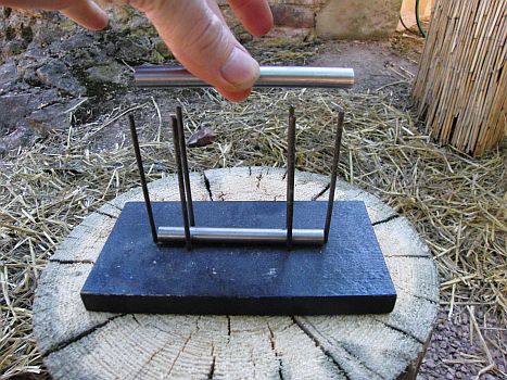 Auf den Magnetismus als eine dritte Kraft, die - neben Schwerkraft und Energiewelle - das Universum durchweht, muss immer mal wieder hingewiesen werden. Diese kleine Apparatur hier lässt einen Stab schweben. Ich löse den oberen Stab energisch vom unteren, auf dem er dicht liegt. Drehe ich den Stab nun um, so meidet er den Kontakt zum unteren Stab und schwebt. Der Erwachsene, der die Vorführung sieht, kann das Ergebnis vorhersagen und den Ablauf mit seinem Schulwissen erläutern. Dass wir hier eine Wunderkraft für uns arbeiten lassen, versuche ich in der kleinen Schau, die hier fotografisch vorgeführt wird, lebendig zu erhalten.