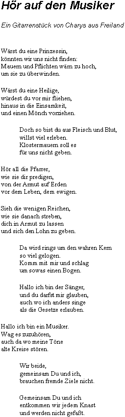 [ Home ] [ Nach oben ] [ Reisestart ] [ Morgengebet ] [ Alraunenschrei ] [ Das Mittagsopfer ] [ Freiland-Lied ] [ Feierabend ] [ Hör auf den Musiker ] [ Der Geile ] [ Alchemie ] [ Teufel ] [ Wirbel ]