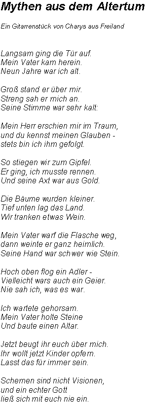 der Bibel: Abraham) beabsichtigt, dieses Kind seinem Gott zu opfern. Gott?