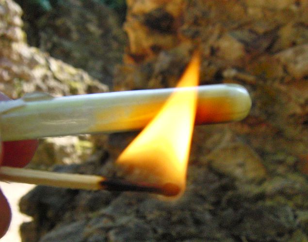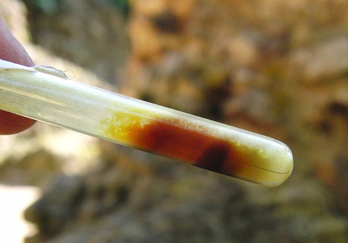 Heize ich den Stoff mit einer Flamme, färbt er sich rot. Oberhalb von 60 Grad